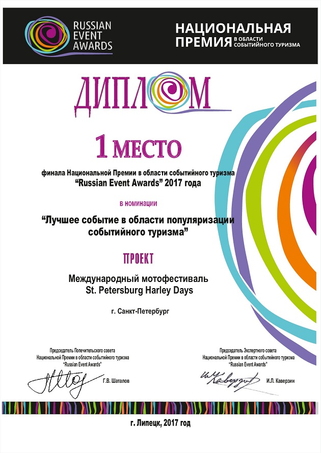 Мероприятие не первый раз подтверждает свою важность для Санкт-Петербурга и России в этой международной премии, в 2015 году Фестиваль вышел в финал среди 688 проектов, заняв 2-ое место в номинации «Лучшее мероприятие в области популяризации событийного туризма», а также вошел в пятерку лучших мероприятий России по оценкам зрительских и судейских симпатий. В Северо-Западном федеральном округе St.Petersburg Harley Days получил диплом победителя Russian Event Awards.