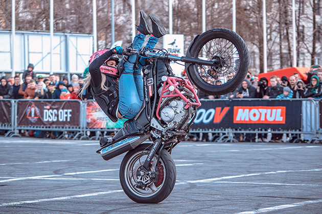 Примерно такие же эмоции испытали зрители I этапа чемпионата России по стантрайдингу, прошедшего 20-22 апреля в рамках международного мотосалона IMIS 2018 в Санкт-Петербурге. Рекорд прошлого года по количеству участников был побит сразу, в город на Неве за места на подиуме приехали бороться 33 спортсмена. Отличился на I этапе Motul Stunt Champ не только количеством участников, но и их разнообразием. Девушки в стантрайдинге пока еще редкость в России, поэтому нам есть чем гордиться - в этом году в чемпионате участвую аж две представительницы прекрасного пола. Дарья Харченко, участница класса OPEN: «Я раньше просто ездила по городу на мотоцикле, но в один прекрасный день, на одном из мероприятий, я увидела завораживающие трюки спортсменов и у меня появилась мечта! Самое сложное на соревнованиях для меня - справиться со своими эмоциями. Я всегда говорю себе: «Надо получить от этого всё, ведь с тобой это больше не повторится. У меня есть цель - пересесть на более тяжелый мотоцикл, который уже давно ждёт своего часа».
