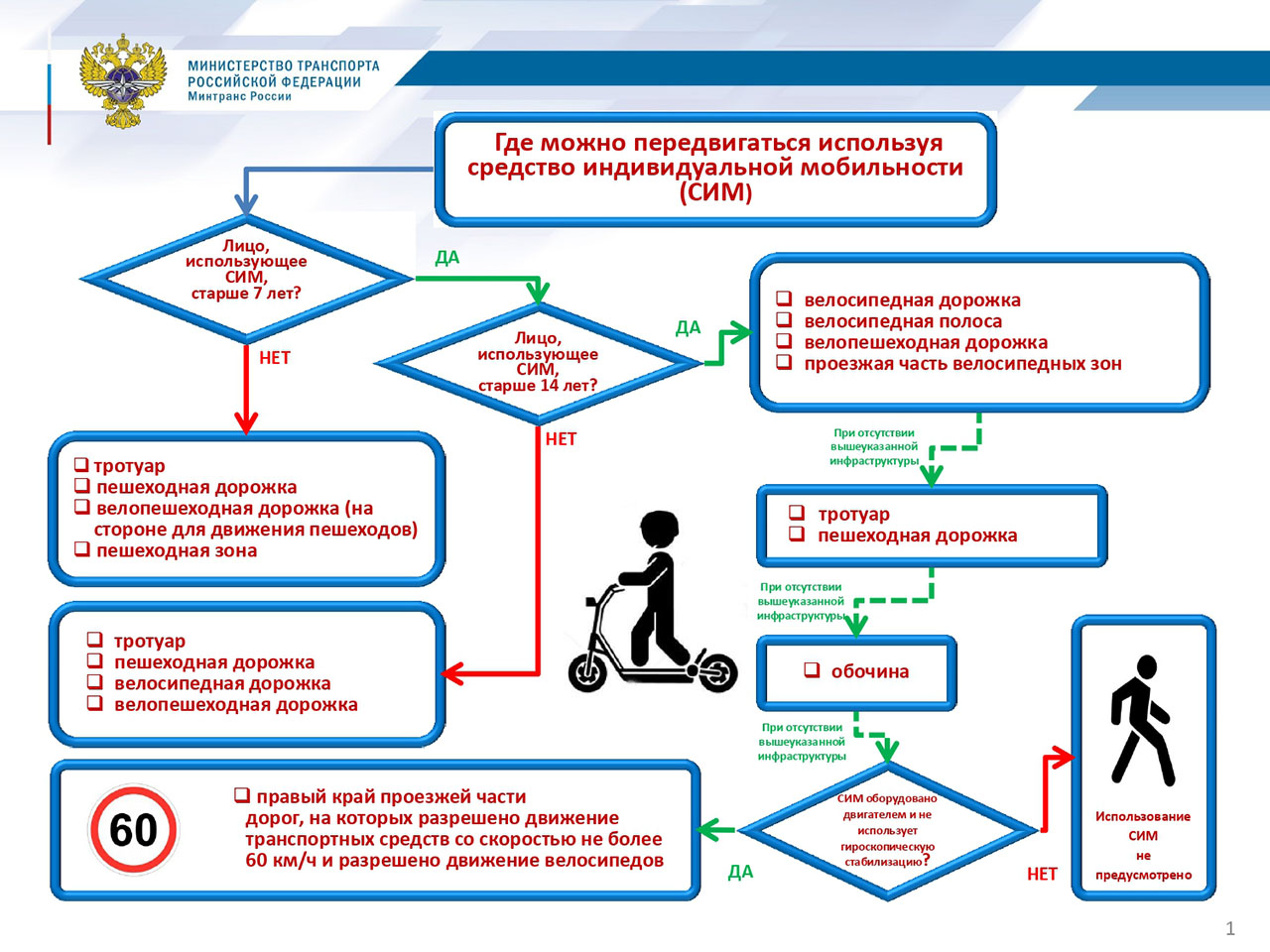 Езда по правому краю проезжей части будет возможно только на дорогах со ограничением скорости 60 км/ч и при наличии электродвигателя, тормозов и звукового сигнала у транспортного средства. Кроме того, для езды по проезжей части потребуются световозвращатели — белые спереди, оранжевые или красные с боковых сторон, красные сзади, и фара белого цвета спереди для сумерек или темноты. Гироскутерам и моноколесам запретят выезд на проезжую часть.