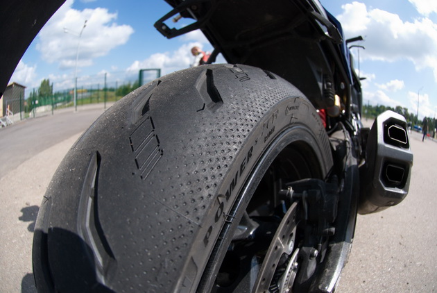 Передняя шина бывает только в одном размере – 120/70 ZR17. Зато задние бывают шириной от 160 до 200 миллиметров. Наличие размера 200/55-17, устанавливаемого на современные литровые спортбайки, говорит о серьёзных амбициях производителя, не боящегося предлагать гражданскую резину для мотоциклов класса Superbike. Насколько оправданы эти амбиции?